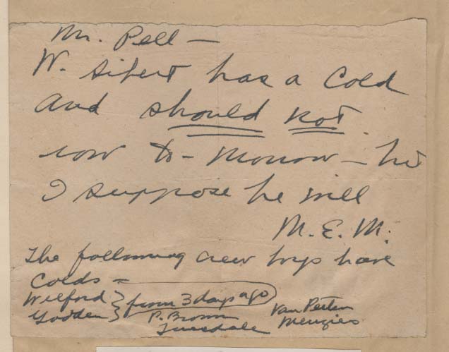 A note sent to the Headmaster from Nurse Margaret E. Miller, circa 1937-1939: