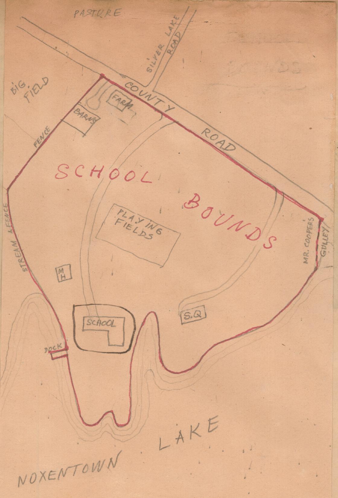 This hand drawn map lays out the school boundaries from the Farm to Mr. Cedric Cooper's house on County Road (now Noxontown Road); and along the stream and pond borders. Mapmaker is unknown.