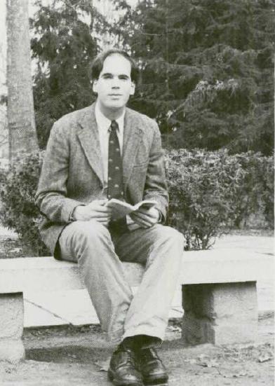 In 1985 future Headmaster Tad Roach was an English Teacher. Here he sits with a book on a stone bench.