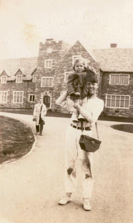 Melissa Pell getting a ride on student Arthur Patten's '36 shoulder. Howard Schmolze is in the background.