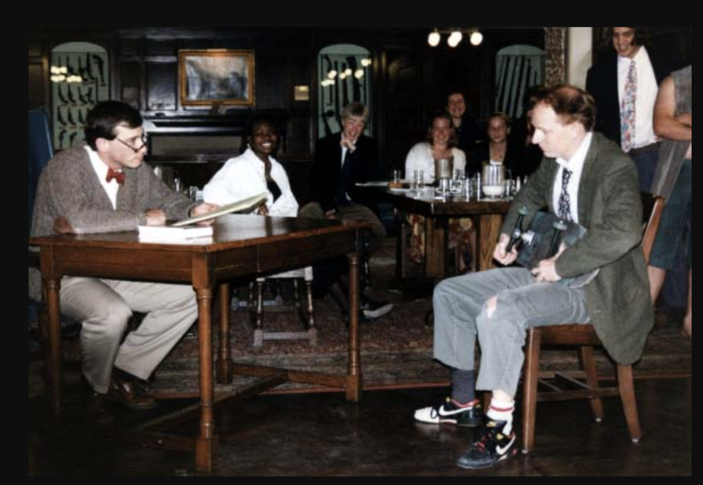 Photo: Faculty, 1997 | "Bobby Rue and John Austin Perform Skit for JBob's Retirement" 1997 Photo In celebration of Jon O'Brien's retirement, students and faculty held a party in his honor. Faculty members John Austin and Bobby Rue perform a skit.