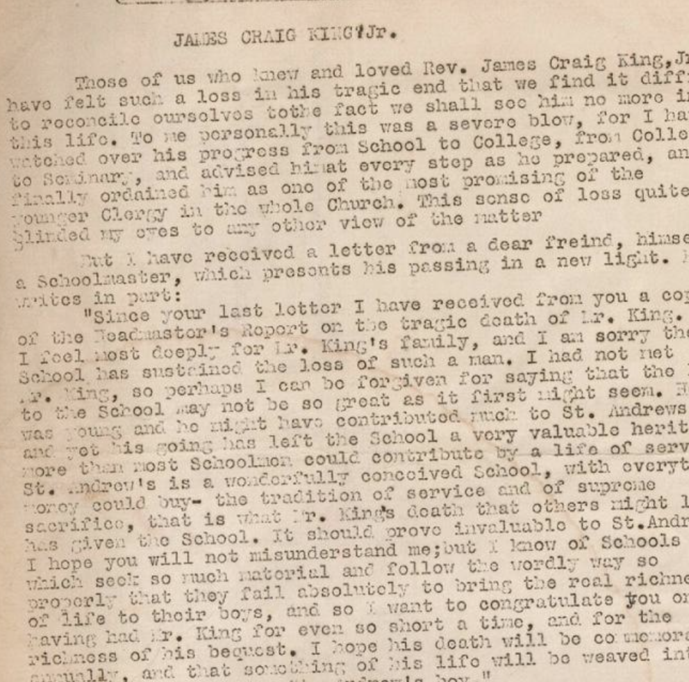 Editorial from the Rt. Rev. Philip Cook about the death of Rev. James C. King, Jr. on Noxontown Pond and of its meaning for the School.